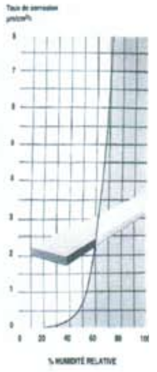 Le diagramme de la figure (Courbe de Vernon), qui donne le taux de corrosion en fonction de l’humidité relative de l’air prouve que celui-ci ne varie pas proportionnellement à l’humidité ambiante. En de ça de 35%, la corrosion est stoppée, en de ça de 60% elle évolue très peu. Au-delà de 60%, la corrosion s’accélère.