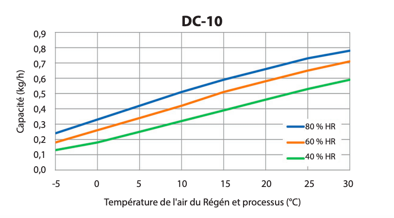 La capacité de déshumidification est calculée à partir de la capacité nominale x par le facteur K du diagramme de correction.