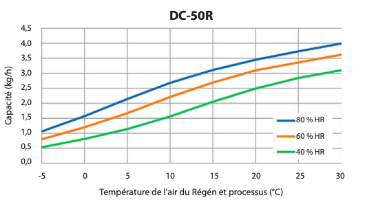 La capacité de déshumidification est calculée à partir de la capacité nominale x par le facteur K du diagramme de correction.