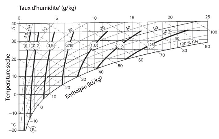 La capacité de déshumidification est calculée à partir de la capacité nominale x par le facteur K du diagramme de correction.