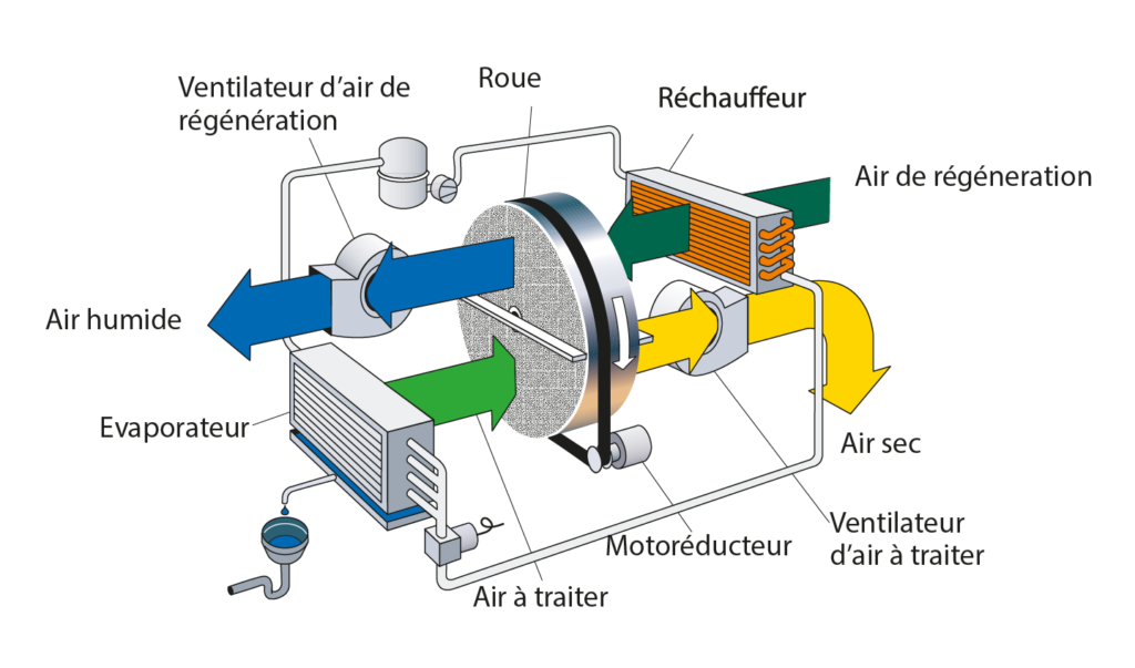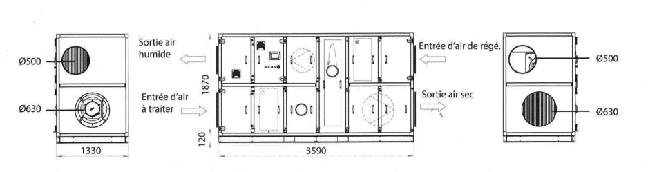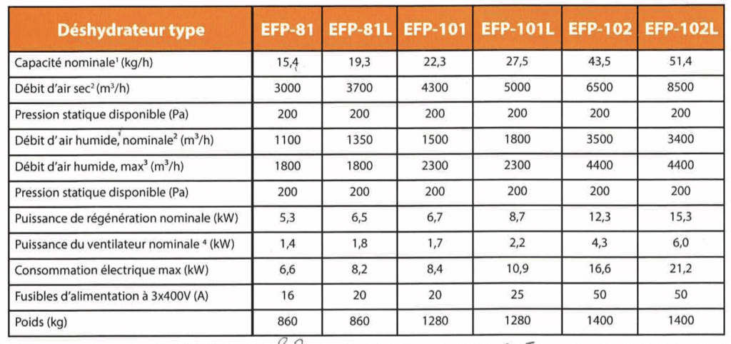 Par cbk / 25/06/2025 Déshumidificateurs Econosorb EFP – 81, 81L, 101, 101L, 102, 102L Capacité de déshumidification à 20°C / 60%HR 15,4 – 51,4 kg/h Débit d’air sec 3000 – 8500 m³/h Basse consommation d’énergie Compresseur haut rendement à vis Ventilateur haute efficacité avec pales profilées et MCE Contrôle linéaire du compresseur permettant de descendre à 30% de la capacité Double panneau isolé laine de roche, épaisseur 47mm Contrôle automatique du ventilateur de régénération Automate PLC type C4 avec clavier tactile et Modbus RTU Options : Contrôle du flux process et de la pression statique Télécharger la fiche produit Location SAV Vente DONNÉES TECHNIQUES Valable pour ds conditions d’entrée de 20C/60% HR, et débits d’air nominaux. A 20C et 60% HR, T d’entrée sur le circuit de regénération Afin de tourner avec la puissance max du compresseur avec une entrée d’air de régénération à 30C A 20C et 60%HR, T d’entrée sur le cicruit de process et celui de régénération PRINCIPE DIMENSION Changement sans préavis. Télécharger le plan d’installation sur www.dst-sg.com NOUS CONTACTER Votre demande concerne* : —Veuillez choisir une option—VenteSAVLocationAutres Entreprise* Nom/Prénom* : Email* : Numéro de téléphone* : Région* : —Veuillez choisir une option—Est/NordSud Est/ SudCentreOuest Votre message* Conformément à la Loi Informatique et Libertés du 6 janvier 1978 modifiée et au Règlement Européen du 27 avril 2016, vous disposez d’un droit d’accès, de rectification, d’effacement et de portabilité des données, ainsi qu’un droit à la limitation et à l’opposition du traitement. Vos données à caractère personnel ne sont pas conservées au-delà de la durée nécessaire à la finalité de leur traitement, sous réserve du respect des délais de conservation nécessaires.