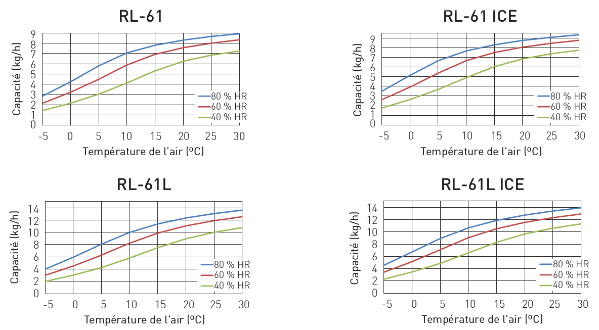 ¹ Valable pour des conditions d’entrée de 20°C / 60%RH et débits d’air nominaux. Pour des conditions d’air différentes, la capacité sera calculée à l’aide du diagramme de correction ci-dessous. ² Débit d’air avec une densité de 1.20 kg/m³.