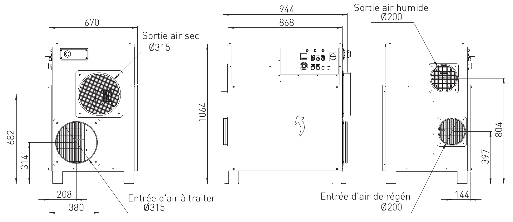 1. Contrôle des débits d’air par un variateur de fréquence 2. Protection du filtre 3. Régulation linéaire de la capacité de déshumidification 4. Contrôle de l’humidité intégré 5. Entrées d’air isolées